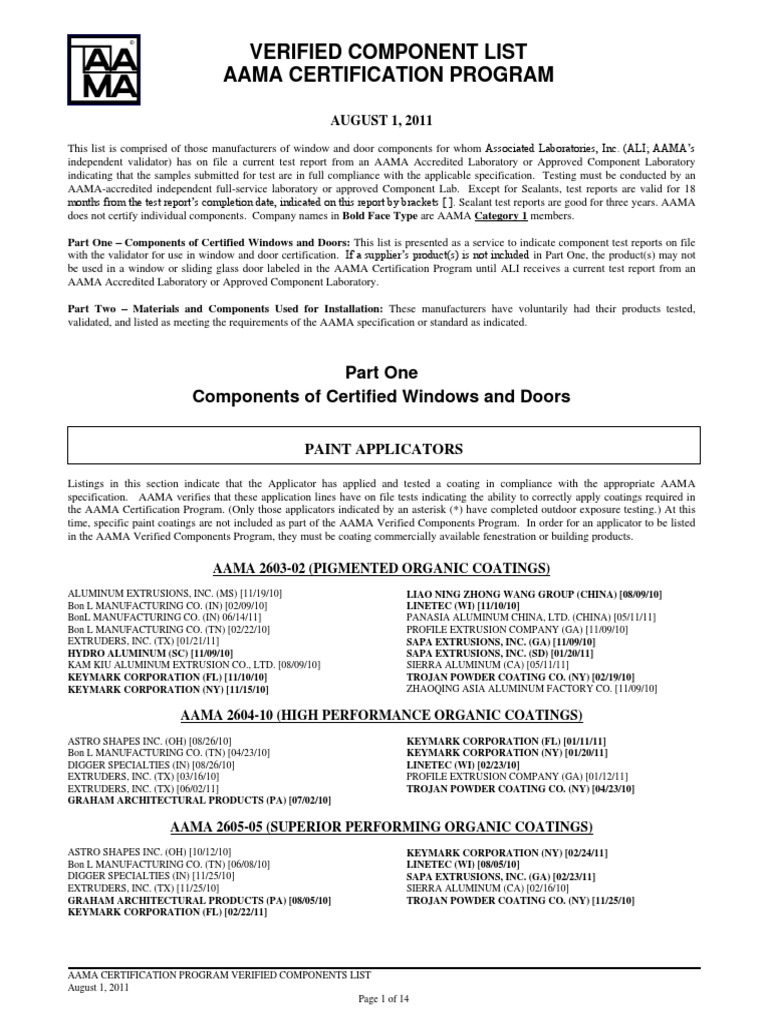 Verified Components List - aamanet.org Aug 01, 2015 · the component is listed. AAMA does not certify individual components. Company names inBold Face Type are AAMA Category 1 members. Part One –Components of Certified Windows and Doors: This list is presented as a service to indicate component test reports on file with the validator for use in window and door certification.