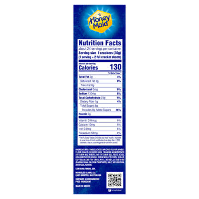 PDF NABISCO HONEY MAID GRAHAM CRACKERS Nutrition Facts NABISCO HONEY MAID GRAHAM CRACKERS 200 / 2ct Whole Grain Graham Crackers; Meets K-12 NSLP & Smart Snacking ... Product Last Saved Date:09 July 2015 Nutrition Facts Serving Size: Number of Servings per Package: Amount Per Serving Calories: Calories from Fat: ... RIBOFLAVIN {VITAMIN B2}, FOLIC ACID), SUGAR, SOYBEAN OIL, HONEY, LEAVENING (BAKING ... Nutrition Facts for Honey Maid Honey Graham Crackers Honey Maid Honey Graham Crackers Nutrition Facts Serving Size sheets 2 sheets = 31g Amount Per Serving 130 Calories % Daily Value* 5% Total Fat 3g 0% Saturated Fat 0g Trans Fat 0g 0% Cholesterol 0mg 7% Sodium 160mg 8% Total Carbohydrate 24g 4% Dietary Fiber 1g Total Sugars 8g 16% Includes 8g Added Sugars Protein 2g 0% Vitamin D 0mcg 1% Calcium 13mg Honey Maid Graham Crackers Nutrition Facts & Calories - Inlivo Rich in vitamins and minerals (7.3%/cal) - a good source of Vitamin K, Iron, Copper, Selenium, Magnesium and Phosphorus. Contain a high amount of risky components that may include saturated fat, cholesterol, sodium and sugars (0.05%/oz). Good source of proteins (11% of DV/100g). Good source of fiber (21% of DV/100g). Nabisco Honey Maid Grahams Crackers Nutrition Facts Below are the nutrition facts and Weight Watchers points for a serving of Nabisco Honey Maid Grahams Crackers. Nabisco Honey Maid Grahams Crackers Calories There are 130 calories in a serving of Nabisco Honey Maid Grahams Crackers. Most of those calories come from carbohydrates (79%). Nabisco Honey Maid Grahams Crackers Nutrition Facts