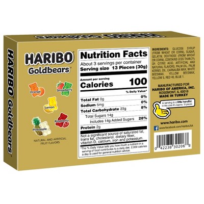 Haribo Gold-Bears Gummi Candy Allergy and Ingredient Information Nutrition Label Nutrition Facts Serving Size 39.00 g Servings Per Container 3.00 Amount Per Serving Calories 130 % Daily Value* Total Fat 0g 0% Sodium 0.01g 0.41% Total Carbohydrates 30g 10% Sugars 19g Protein 3g *Percentage Daily Values are based on a 2,000 calorie diet. Your daily values may be higher or lower depending on your calorie needs.