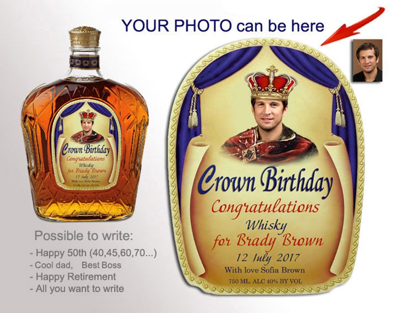 Crown Royal Labels | Etsy CustomCrownByJB (55) $7.50 Personalized Label to fit Crown Royal 750ml & 1.75L Bottle - For Birthdays, Weddings, Christmas, or any other occasion. CreativeWorksByJG (474) $12.50 Bestseller Personalized Crown APPLE Label, Crown Royal Apple Label, Crown Royal Birthday Label, Groomsman gifts, Liquor Labels LabelDesignShop (1,678) $4.99