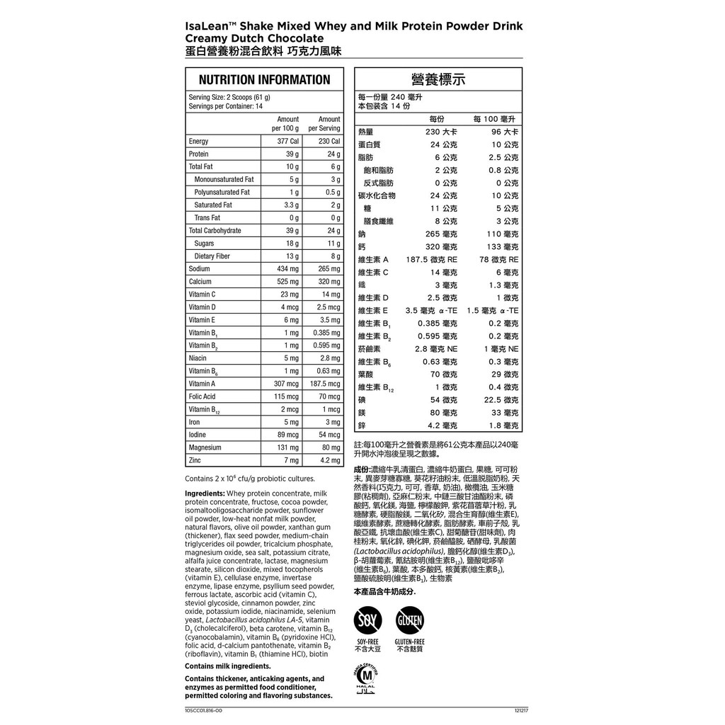 Dairy free isalean shake nutrition facts. Isagenix Isalean Shake Review - DietShakeReviews However, if you do not add any other ingredients into the shakes, then this shake might be okay on calories. While many meal replacement shakes include between 100 to 200 calories per serving, some shakes have less than 100 calories per serving. With the Isagenix shake, you would be taking in as much as 480 calories a day with just 2 daily ... IsaLean® Shake by Isagenix IsaLean® Shake is clinically shown to aid weight loss while supporting lean muscle growth. At 240 calories, the high-protein, balanced nutritional profile keeps you feeling full longer without depriving your body of much needed nutrition. This is not just a shake, it's a delicious meal! 24 grams of high-quality, undenatured whey and milk protein Buy IsaGenix Dairy Free IsaLean Protein Meal Replacement Shake IsaLean Shake Dairy-Free supports weight loss and lean muscle growth. At 250 calories, the high-protein, balanced nutritional profile keeps you feeling full longer without depriving your body of much needed nutrition. This is not just a shake; it's a total meal. Dairy-Free in Action IsaLean Shake Dairy-Free in Vanilla Chai and Rich Chocolate use Nutrition Facts for Isagenix Dairy Free IsaLean Shake - MyFoodDiary Dairy Free IsaLean Shake - Rich Chocolate Nutrition Facts Serving Size packet 1 packet = 63g Amount Per Serving 250 Calories % Daily Value* 12% Total Fat 8g 10% Saturated Fat 2g Trans Fat 0g 0% Cholesterol 0mg 17% Sodium 390mg 7% Total Carbohydrate 22g 29% Dietary Fiber 8g Sugars 6g Protein 24g 8% Calcium 100mg 40% Iron 7.2mg 0% Vitamin A 0mcg