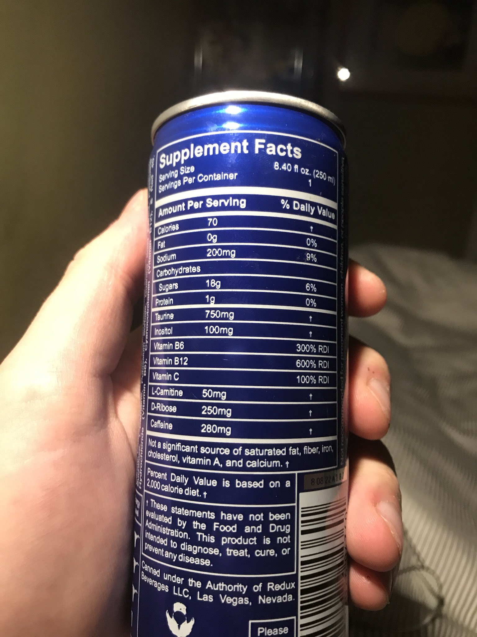 Calories in Redux Beverages Cocaine Energy Drink and Nutrition Facts Cocaine Energy Drink Nutrition Facts Serving Size 1 can (250 ml) Amount Per Serving Calories 70 % Daily Values* Total Fat 0.00g 0% Saturated Fat 0.000g 0% Trans Fat - Cholesterol 0mg 0% Sodium 200mg 9% Total Carbohydrate 18.00g 7% Dietary Fiber 0.0g 0% Sugars 18.00g Protein 1.00g Vitamin D - Calcium - Iron - Potassium - Cocaine Energy Drink Official 250ml Slim Can Carbohydrates 11.4g ( of which sugar 11.4g), Fats 0g (of which Saturated 0g), Fibre 0g, Sodium 0.07g, Vitamins: Riboflavin (B2) 0.6mg (43%) Niacin (B3) 7.2mg (45%), Panthotenic Acid (B5) 2mg (33%) B6 0.8mg (57%), B120.4pg (16%). RDA = Recommended daily allowance. Redux Beverages Cocaine Energy Drink - Photo - FatSecret Cocaine Energy Drink. Nutrition Facts. Serving Size: 1 can (250 ml) Amount Per Serving. Calories. 70 % Daily Values* Total Fat. 0.00g. 0%. Saturated Fat. 0.000g. 0%. Trans Fat-Cholesterol. 0mg. 0%. ... FatSecret makes no representations or warranties as to its completeness or accuracy and all information, including nutritional values, is used ...