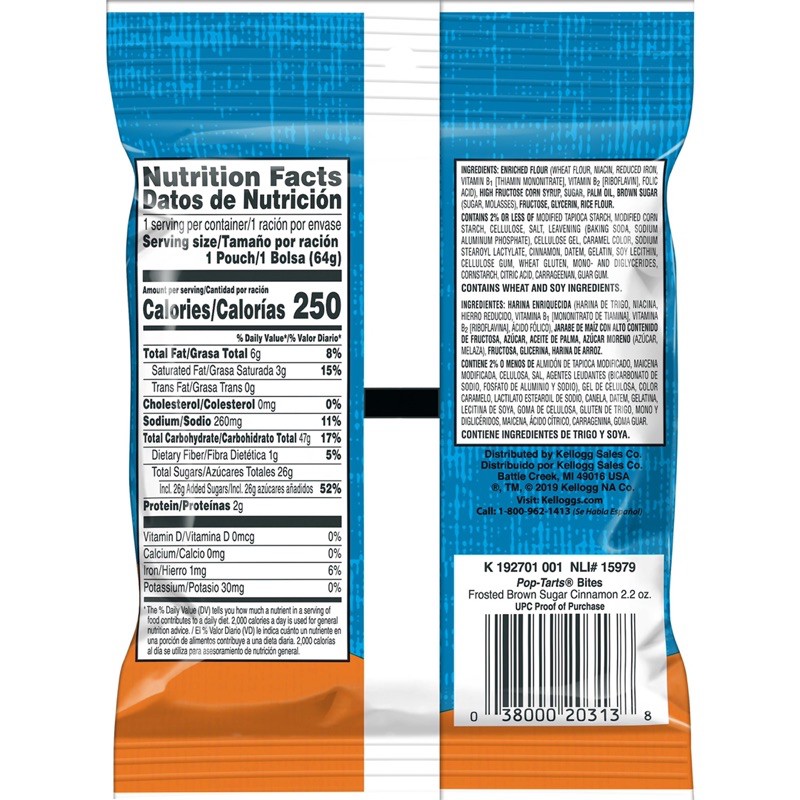 Brown Sugar Cinnamon Pop-Tarts® Bites - SmartLabel™ Brown Sugar Cinnamon Pop-Tarts® Bites 14.1 oz 00038000203060 Nutrition Ingredients Allergens Features & Benefits Company, Brand & Sustainability 150 Calories 2 g Sat Fat 160 mg Sodium 16 g Sugar Nutrition Facts Servings Per Container 10 Serving Size 1 Pouch (40 g) Calories in Kellogg's Pop-Tarts Bites - Frosted Brown Sugar Cinnamon ... There are 150 calories in 1 pouch (40 g) of Kellogg's Pop-Tarts Bites - Frosted Brown Sugar Cinnamon. Get full nutrition facts for other Kellogg's products and all your other favorite brands. ... of Kellogg's Pop-Tarts Bites - Frosted Brown Sugar Cinnamon. Calorie breakdown: 21% fat, 77% carbs, 3% protein. Related Snacks from Kellogg's: Special ...