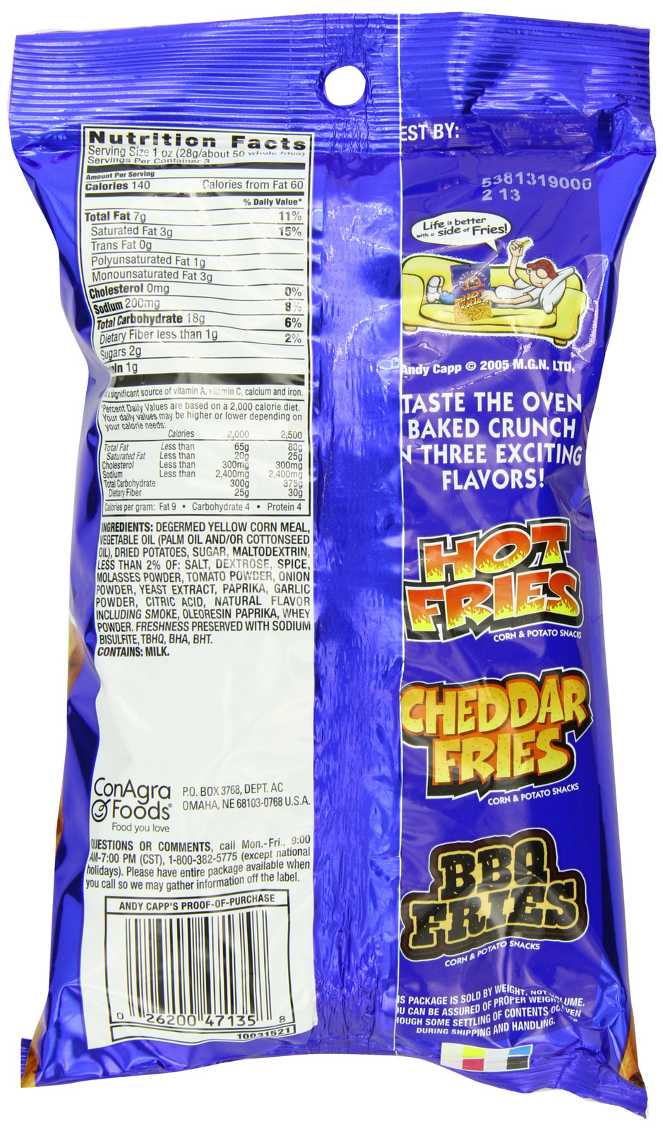 Andy Capp's Hot Fries Corn & Potato Snack 3oz Bag Item #: 37053. Brand: Andy Capp's. UPC #: 026200471594. More Info. Ingredients. Nutrition Facts. Life is better with a side of fries!Taste the oven baked crunch in three exciting flavors!Hot fries corn & potato snacks.Cheddar fries corn & potato snacks.BBQ fries corn & potato snacks.This package is sold by weight, not volume.