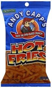 Andy Capp's Hot Fries, 8 Oz. | Big Lots Product Overview. Description. Tear into a big bag of Andy Capp's Hot Fries and taste the oven baked crunch. These corn and potato snacks are have zero grams of trans fat per serving and make a delicious anytime treat. Product Details.