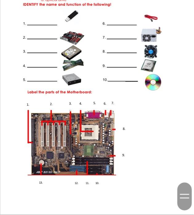 Motherboard | Components | Function | Diagram - Electrical Academia Figure 1: Motherboard Diagram with all components labeled There are several components that comprise a motherboard. In this lesson, the following main components will be highlighted: System Clock Chipset Expansion Cards and Slots Front Panel Connectors Basic Input/Output System (BIOS) Complementary metal-oxide-semiconductor (CMOS) A Basic Guide to Identifying the Major Components of a Laptop Identifying the Battery Identifying the System Fan Identifying the AC Adapter and Cable Identifying the Heatsink Identifying the Motherboard Identifying the Wireless (WLAN) Card Identifying the 3G/Broadband (WWAN) Card Identifying the Bluetooth Card Identifying the Keyboard Identifying the LCD Article Properties Affected Product Motherboard Components Labeled - Motherboard Parts and Functions PDF ... Motherboard. we explain the different parts of a motherboard with pictures. RAM. At the first glance, the components. Power Supply Start Download of a motherboard can appear. complicated... even daunting to. Hard Drive - View PDF some. How are we supposed to Recommended. figure out this big jumble of Motherboard CPU. 27 Main Parts of Motherboard and its Function - OurTechRoom Parts of Motherboard 1) RAM chip and RAM Slot 2) CPU Chip and Socket 3) PCI Slots and PCI Chip 4) ROM Chip 5) AGP Slot and Chip 6) North Bridge 7) South Bridge 8) CMOS Backup Battery 9)Power Supply Plug 10) SATA and PATA Port and Connector 11) eSATA Port 12) eSATAp Port 13) SCSI Port 14) Parallel Port 15) Serial Port 16) PS/2 Port 17) USB Port